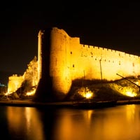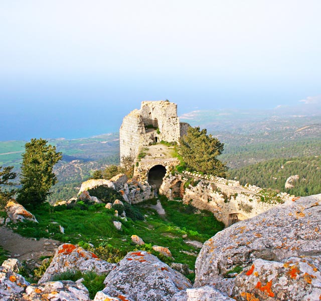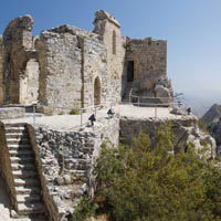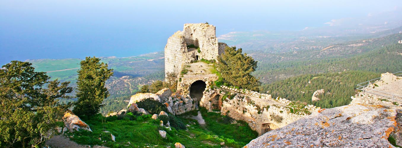 Buffavento stands higher, and St. Hilarion can show more perfect ramparts and turrets, but neither recalls so strangely a forgotten age, neither seems to be so thickly peopled with its ghosts, as this lonely ruin on its pillar of rock. No painter’s wildest fancy has pictured anything so fantastic as these Cyprian castles, and, standing at the foot of the last step leading to the gate of Kantara, and involuntarily recalling the fairy-towers of romance, the traveller might imagine it the stronghold of a Sleeping Beauty, untouched by change or time for a thousand years! It is best seen from the north west where the precipice is sheerest, the winding paths seem to cling most dizzily to its face, and the ruins of the interior cannot be seen; but once within the outer gate the illusion partly vanishes in view of broken battlements, although man and horse can still find shelter in many of the chambers.” The name of the castle has several derivations and is referred to in French texts as “Le Candaire”. The name Kantara comes from the Ar Arab words “kandara” meaning a bridge and/or “kandak” meaning castle. According to Cypriot folklore it is called “ta spitia tis reginas” which translates as, the chambers of the Queen. In Turkish it is “yuz bir oda,” a hundred and one rooms. There are many legends as to the outcome of finding the hundred and first room and they vary from the discovery of long buried treasure, to the searcher being suddenly transported to Paradise.