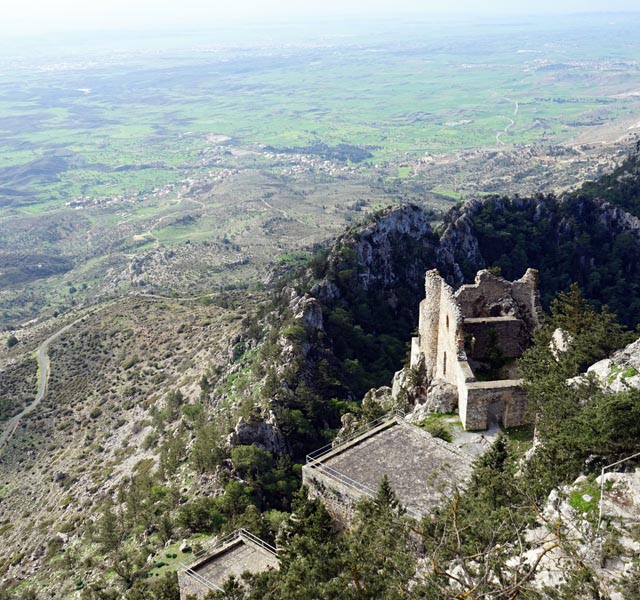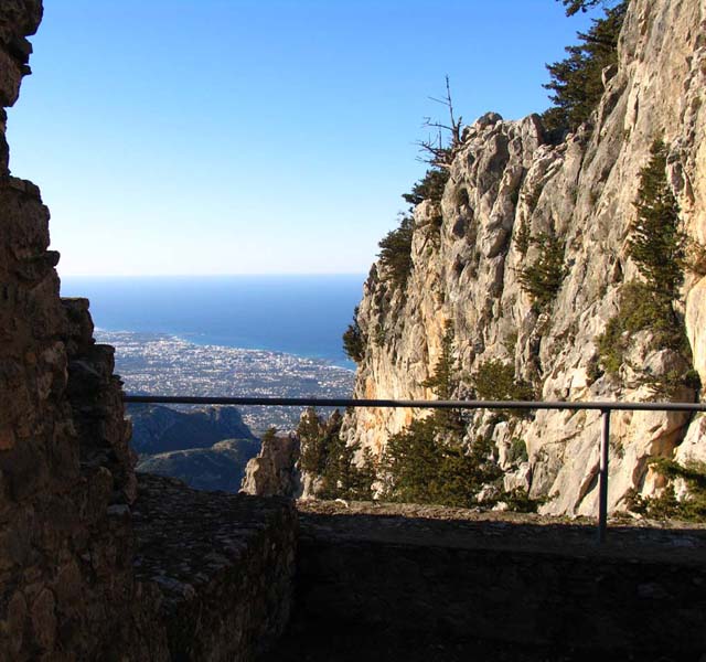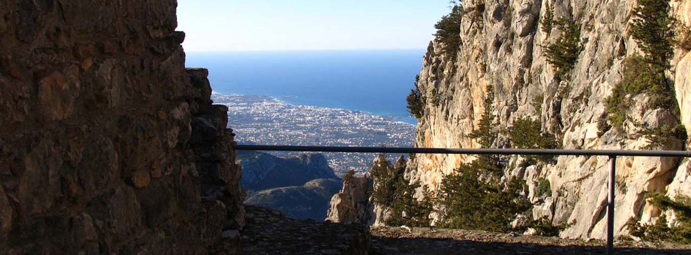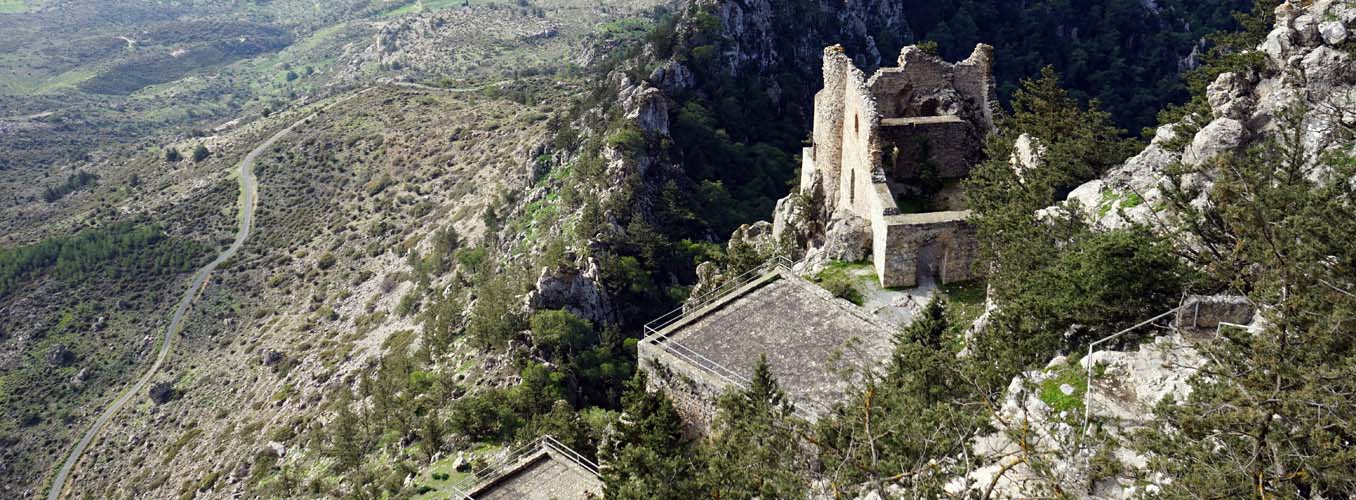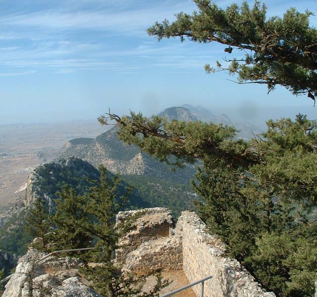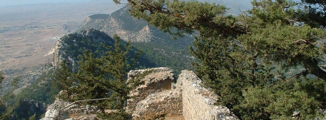 Buffavento is the highest of the three castles built along the Five Finger Mountain ridge and standing at 3,100ft above sea level it provides the most commanding view with a 360 degree panorama across the landscape. From the top most buildings the outlook south encompasses the City of Famagusta, Larnaca Bay, Nicosia and the Troodos Mountains. Northwards, on a clear day, across the Mediterranean, the coast of Turkey is visible only forty miles away. Originally built as a lookout fort by the Byzantines, and enlarged into a commodious castle by the Lusignan rulers in the 13 th C, Buffavento is true to the literal translation of its name. On a stormy day it is certainly buffeted by the winds and frequently wears a fluffy cap of white clouds even in summer. The best access route is from the Five Finger Mountain pass on the road that heads east from Kyrenia. At the top of the hill take the right turning and follow the signs. It is approximately 4 and a half miles before the car park is reached and there are places s to stop and look at the flowers or the view. From the car park a long climb up well made steps is necessary before the main gate is reached. Passing through this gate and entering the lower ward of the two levels, there are still some rooms enclosed from the elements and huge cisterns that once provided the castle inhabitants and their animals with fresh water. A further climb of about 75ft will get the explorer to the upper ward, with an additional short ascent of twelve steps leading to a restored doorway and entrance into a barrel vaulted room which is the only complete room of the upper level. From this room there is a passage with ruined accommodation on both sides and a vertiginous viewpoint at the far end. The highest point is marked by a lightning deflector and from here the vista downwards across the ruined buildings below gives an almost birds-eye picture of the complete lower ward, and in a south westerly direction, peeping out from behind a fold in the mountain can be seen edge of the painted flag of the TRNC. Just to stand at 3,100ft and feel the breeze blowing off the sea; to watch the mares-tail clouds drifting lazily across the sky; to turn 360 degrees and gaze at the spectacular panorama; and if you are lucky to hear the call of buzzards and ravens in flight as they circle the mountain top, will make the climb totally rewarding.